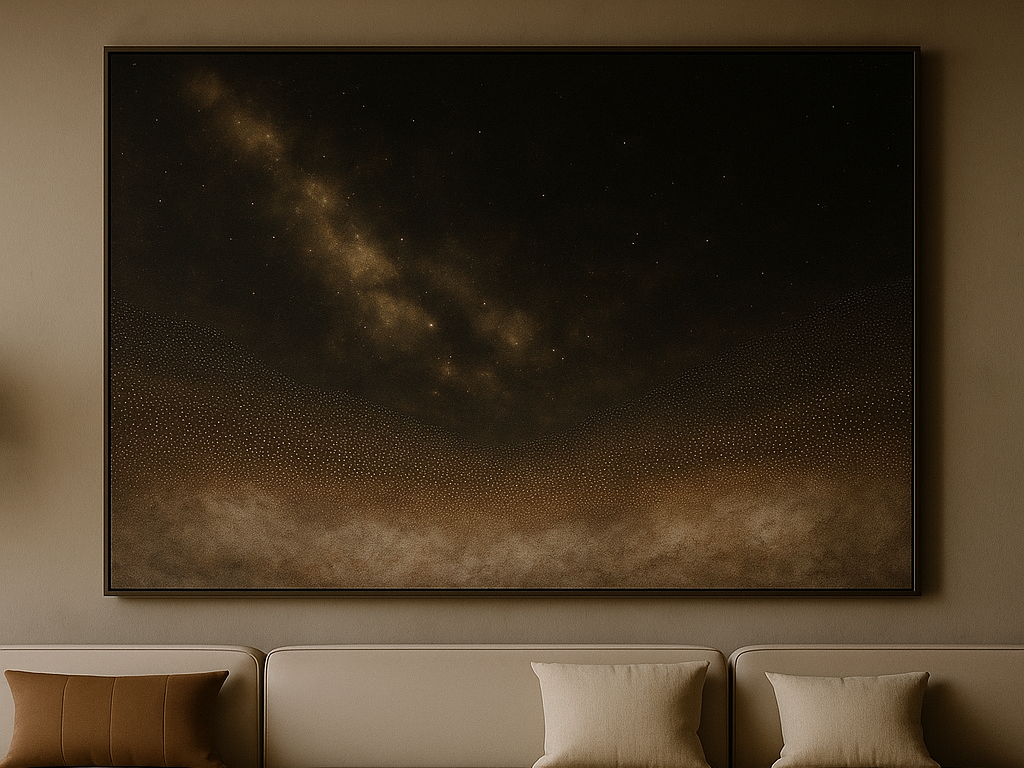 Each piece carries the rhythm of Country beneath the night sky — a dialogue between dust and constellation. Through soft gradients, patient mark-making, and quiet fields of light, these works hold space for reflection and connection. They invite the viewer to slow down, to look up, and to feel the immensity of what lies both above and beneath us.