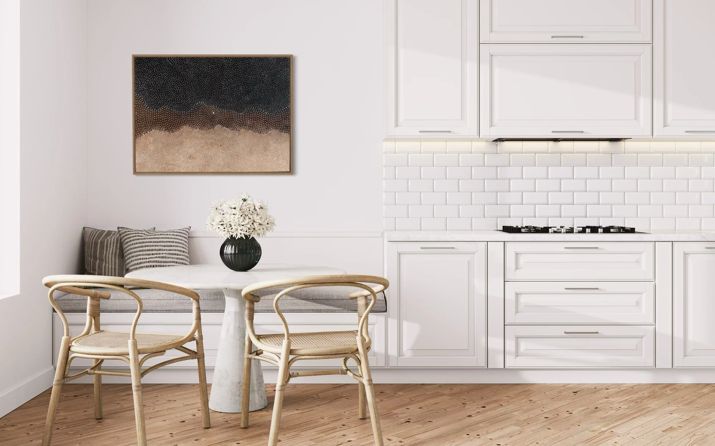 Artist Statement: "These pieces represent two of my favourite ways of depicting our beautiful Australian birds and habitats. Painting two Red-tailed Black Cockatoos, a male and female, in portrait style brings the focus of the artwork to their personalities and enables me to capture their lovely faces and feather details. Alternatively, the pair of Galahs and Red-tailed Black Cockatoos in their habitats, on twisted branches and amongst gumleaves, is a more stylised approach and creates context and story with the interaction of the birds in their natural environment."